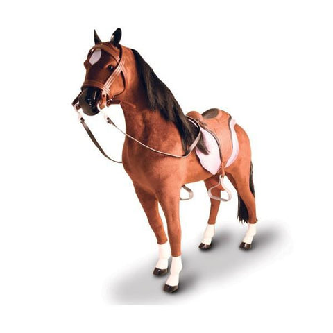 This large plush pony comes with saddle, bridle and rolled up picnic blanket. The removable saddle even has adjustable stirrups. The perfect size for 18" Precious Day dolls.This horse has a wire frame within the body making it very sturdy for the dolls to sit on move into different positions. The hair on the mane and tail can be brushed and styled in endless combinations without tangling. A wire hair brush and pink bow are included for this purpose. Plush horse measures approximately 21" L x 5" W x 15" Tall and is suitable for children aged 3 and up.