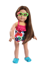 Lovely set comes with tropical swimming suit and matching swim goggles. Goggles so authentic, they are nearly waterproof! Adorable crocs finish out the look.