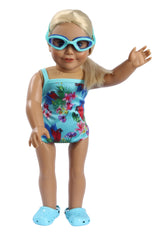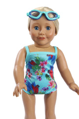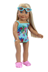 Everything you need here for an afternoon of water fun! Set comes with floral ruffled swimming suit, matching crocs and lovely green sunglasses with tropical flower accents.