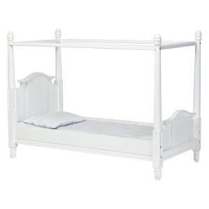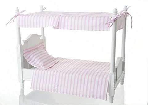 Quality all wood construction, the bed features a white finish and includes one pillow and mattress and pretty pink and white striped canopy and pillow case with bed cover. The perfect way for your 18" doll to sleep the night away.