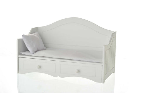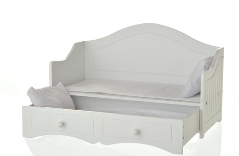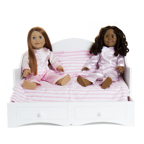 Built in a traditional cottage style with a white finish, Laurent Doll's all wood 18 inch Doll Daybed includes a pullout trundle that can be completely concealed when closed and comfortably sleeps up to two 18" dolls. The left and right sides of the bed feature bead board styling and the arched headboard has a matching arched inset design. Our Trundle bed comes with two sets of linens that include pillows, comforters and mattresses. Measures 21" x 10.5" x 12.75" inches (closed); Easy 20-minutes Assembly Required.18" Doll Daybed with Trundle Features:Comparable with American Girl's Trundle Bed but at a fraction of the cost Quality all wood construction and finished in classic white Pullout trundle can be concealed under the daybed Includes two pillows, mattresses and comforters Measures: 21" x 10.5" x 12.75; Easy 20-minutes Assembly Required Recommended for children ages 8+ years old