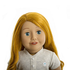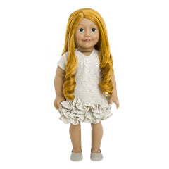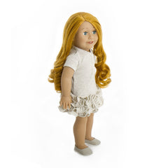 Our stunning fair skin doll 13 with dark blue eyes and long ash blonde curly hair. She comes complete in her bespoke grey dress with ruffled end and beautiful Treasured Dolls flower motif, also included is her faux leather grey mules and underwear. Her skin is high quality vinyl with cloth body perfect for cuddles. Her eyes open for daytime adventures and close when your fun is over and it’s time for bed. With moveable limbs she will make a great companion.