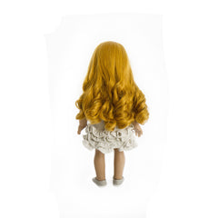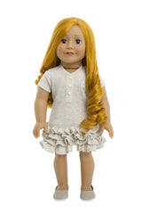 Our beautiful fair skin doll 16 with piercing blue eyes, and long curly red hair and left side parting.  She comes complete in her bespoke grey dress with ruffled end and beautiful Treasured Dolls flower motif, also included is her faux leather grey mules and underwear. Her skin is high quality vinyl with cloth body perfect for cuddles. Her eyes open for daytime adventures and close when your fun is over and it’s time for bed. With moveable limbs she will make a great companion.